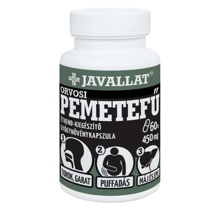 - Az orvosi pemetefű termék fogyasztásának szünetében az alábbi termékek fogyasztásával támogathatja egészségmegőrzését: JAVALLAT® Izlandi zuzmó, JAVALLAT® Kerti kakukkfű