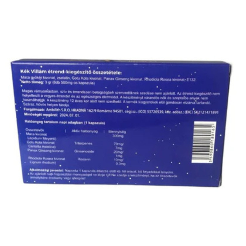 Maca gyökér kivonat, zselatin, Gotu Kola kivonat, Panax Ginseng kivonat, Rhodiola Rosea kivonat, E132.