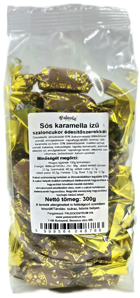 Étcsokoládé 65% (kakaómassza, édesítőszer: izomalt, emulgeálószer: napraforgó lecitin, aroma), sós karamella ízű krém 35% (édesítőszerek: maltitol szirup, izomalt, kakaóvaj, kókusztejpor, tápióka keményítő, aromák, étkezési só, emulgeálószer: napraforgó lecitin, étkezési sav: citromsav, tartósítószer: kálium-szorbát).
